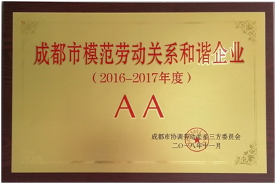 在各项评估中,我公司成都分装厂被成都市协调劳动关系三方委员会授予“2016-2017年度AA级成都市模范劳动关系和谐企业”荣誉称号!